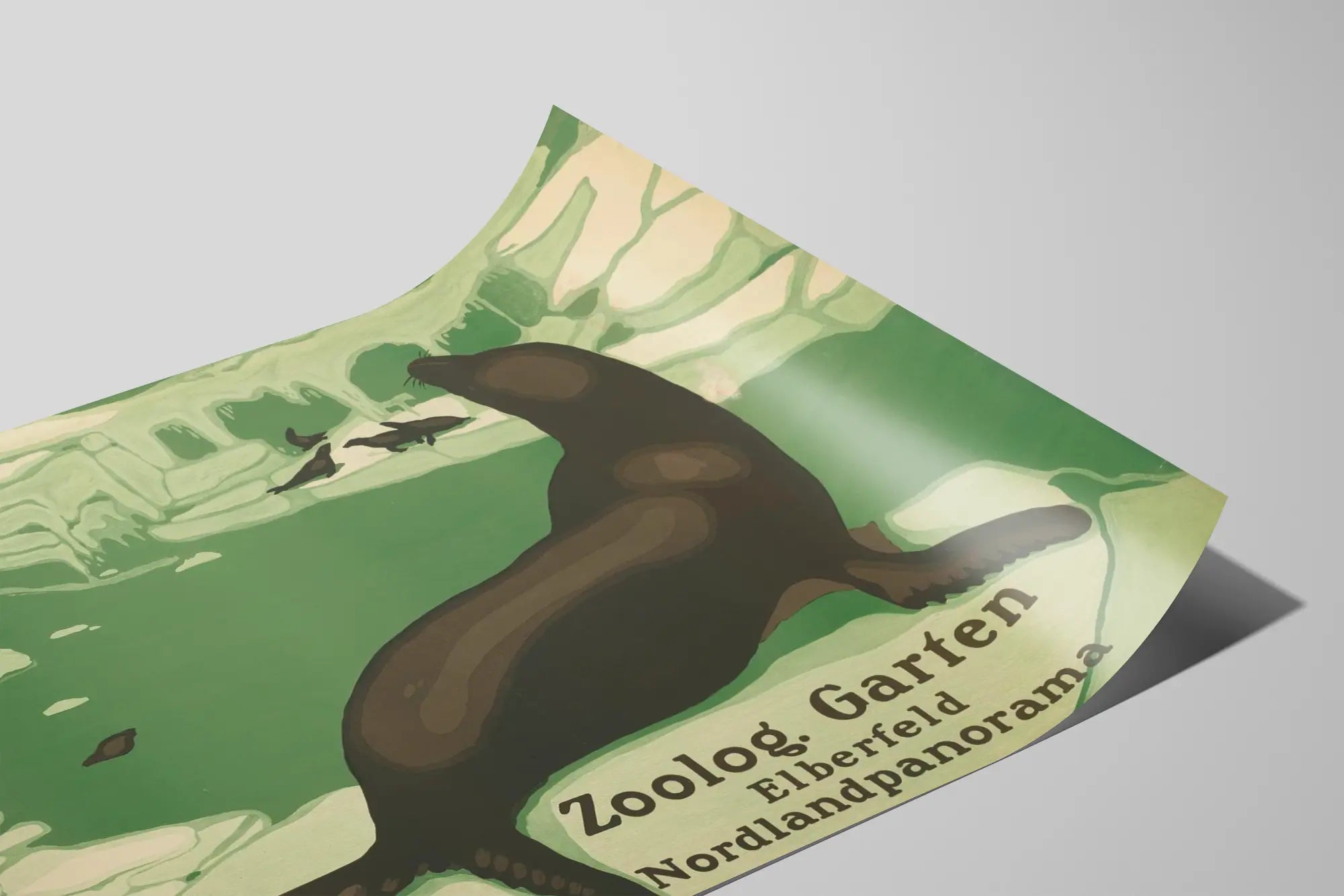 Ge ett retro och naturligt inslag till ditt hem med denna vintageaffisch som föreställer Zoologischer Garten i Elberfeld. Denna väggdekoration framhäver en stiliserad vattenbildscen där en säl står i förgrunden, omgiven av flera små sjölejon på frusna klippor och en grönaktig vattenbassäng. Verket, dominerat av grönt, beige och brunt, skapar en lugn och originell atmosfär, perfekt för älskare av marin fauna och entusiaster av konstnärlig väggdekoration.