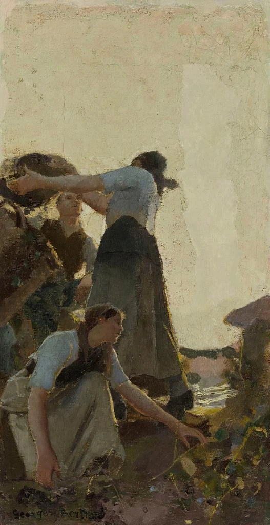 La konsttryck av La vendange av Georges Bertrand framkallar en idyllisk scen där naturen och människan möts i en harmonisk dans. De varma och jordnära färgerna, blandade med gröna nyanser, skapar en atmosfär av lugn och fulländning. Konstnärens teknik, som kombinerar realism och impressionism, gör det möjligt att känna texturen av druvorna och den mjuka ljusstrålningen som sipprar genom bladen. Varje detalj, från vendangeurs ansikte till druvklasarna, är noggrant återgiven, vilket inbjuder betraktaren att fördjupa sig i denna hyllning till skörden.