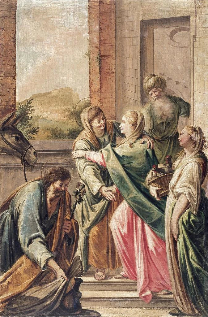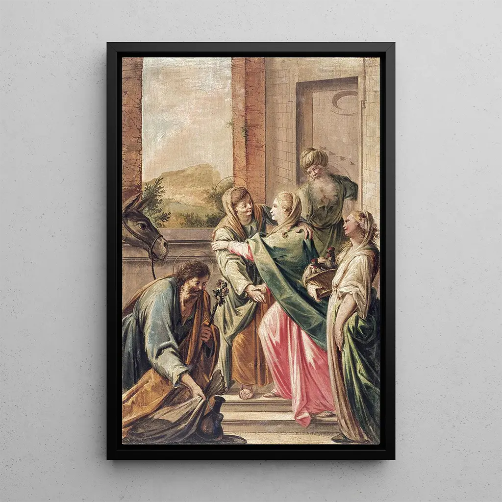 Visitation, ett gripande konsttryck av Francesc Pla Duran, fångar ett ögonblick av möte mellan två ikoniska figurer inom den kristna tron. Den dynamiska kompositionen, där figurerna möts i en varm omfamning, väcker en påtaglig känsla. De livfulla färgerna och ljusspel betonar intensiteten i detta heliga ögonblick, medan konstnärens teknik, som blandar realism och impressionistiska inslag, ger liv åt denna bibliska scen. Tavlan utstrålar en atmosfär av glädje och frid, och inbjuder betraktaren att känna djupet i denna gudomliga visitation.