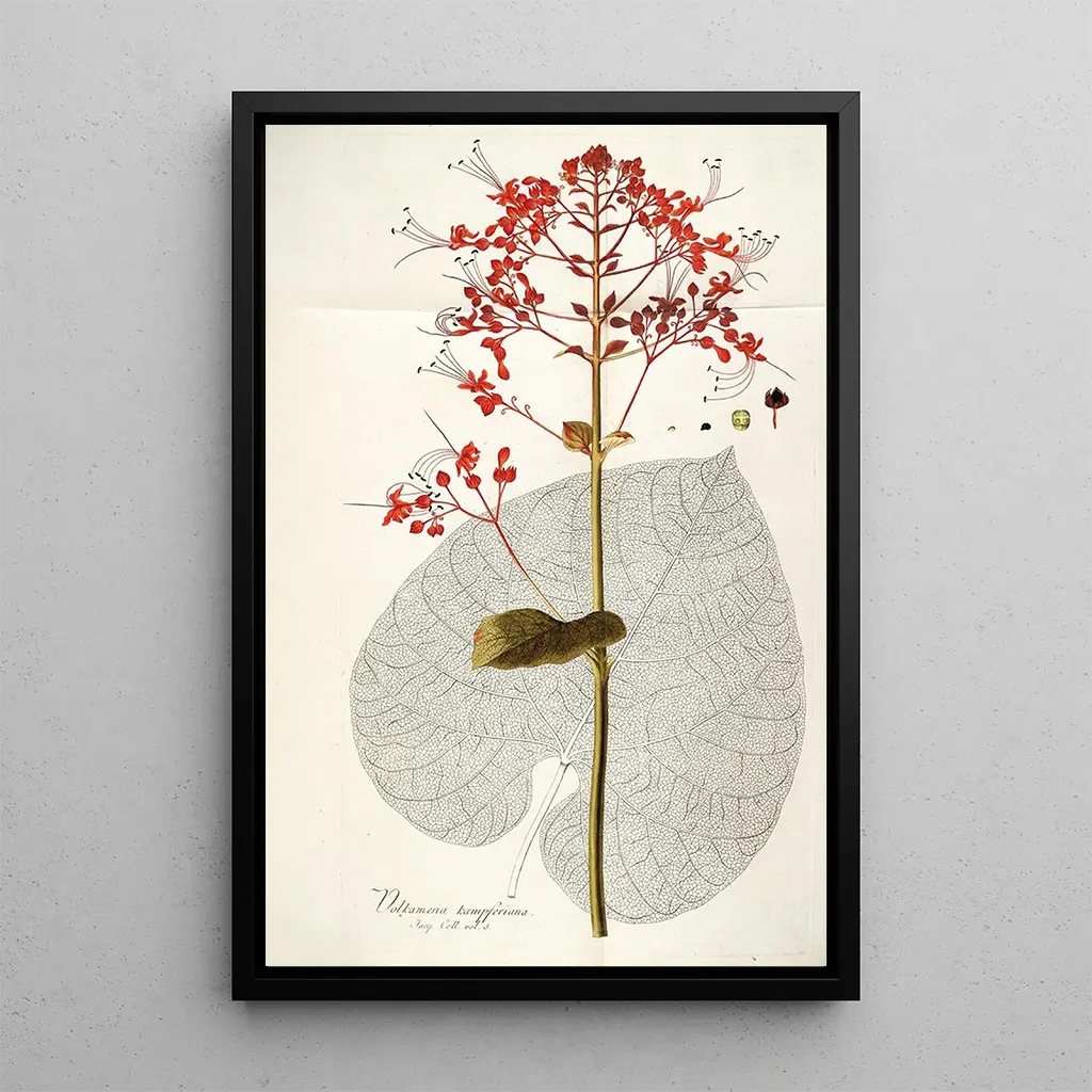 I detta konsttryck av Volkameria kaempferi fördjupar sig konstnären Nikolaus Joseph Freiherr von Jacquin i en rik och färgstark växtvärld. De noggranna detaljerna av blad och blommor, återgivna med en anmärkningsvärt precision, framkallar en atmosfär av lugn och harmoni med naturen. De livfulla nyanser av grönt och gult blandas subtilt, vilket skapar en levande tavla som fångar ögat och inbjuder till förundran. Akvarelltekniken, använd med mästerskap, ger verket en lätthet och flyt som nästan får de botaniska elementen att dansa på duken.