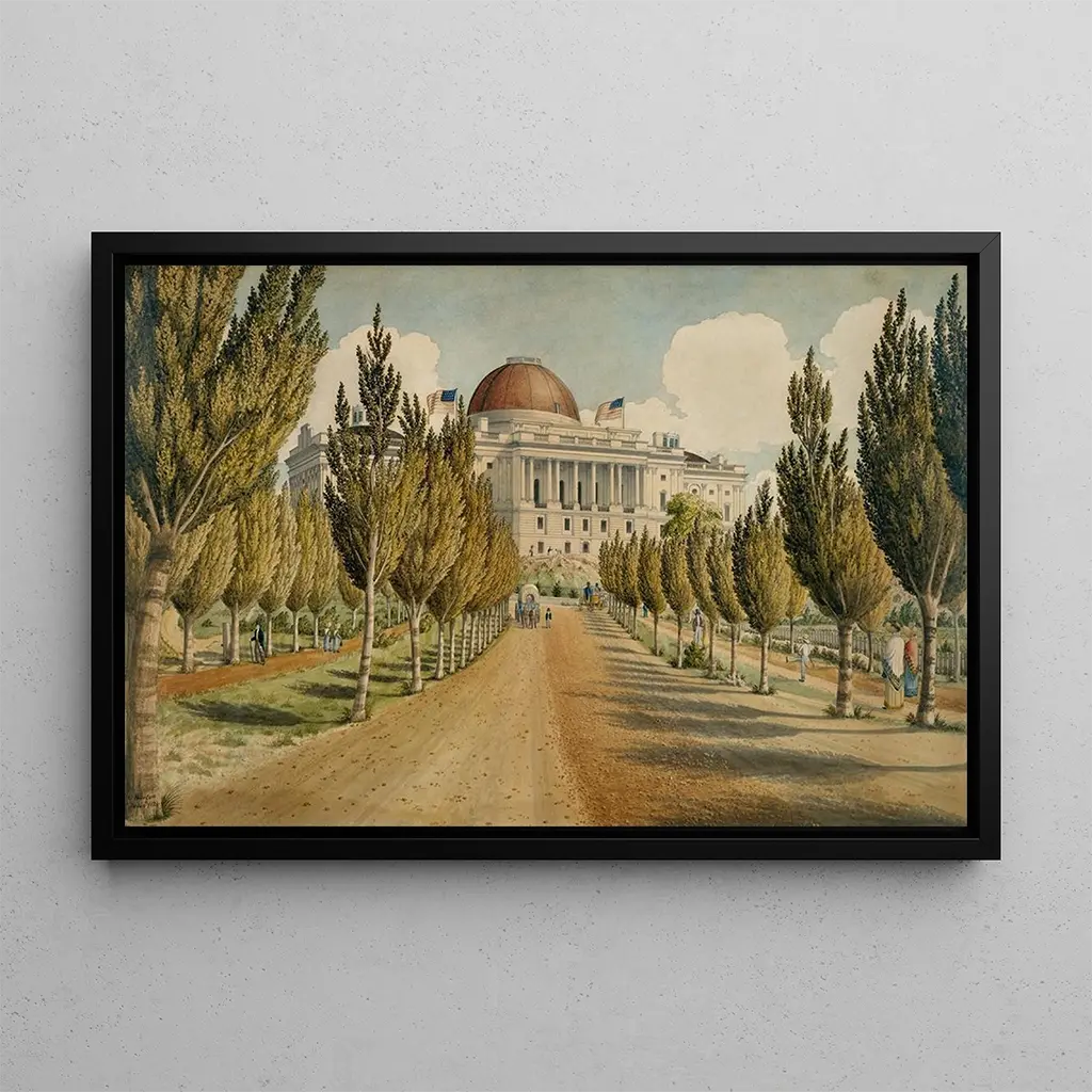 La reproduction de "Vue du Capitole" de Charles W. Burton offre une immersion dans l'architecture emblématique de Washington D.C. Ce tableau, riche en détails, met en avant le Capitole, symbole de la démocratie américaine. Les couleurs vives et les jeux d'ombre créent une atmosphère à la fois solennelle et vibrante. La technique de Burton, mêlant réalisme et romantisme, permet de ressentir la grandeur du bâtiment tout en étant transporté par la beauté du paysage environnant. Chaque coup de pinceau semble raconter une histoire, invitant le spectateur à contempler non seulement l'édifice, mais également le contexte historique qui l'entoure.