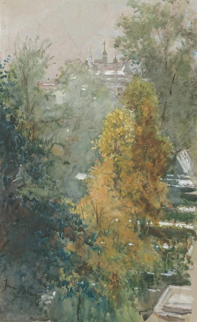 Målning Vy över träd och byggnader - Joan Berg | Konsttryck