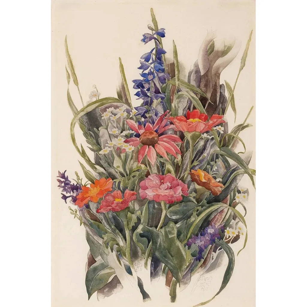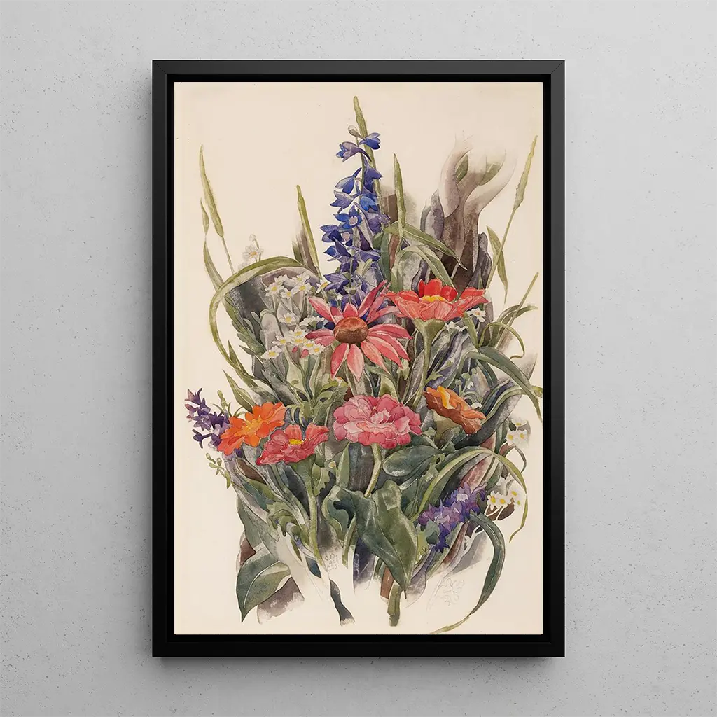 I detta livfulla konsttryck fångar Charles Demuth den flyktiga skönheten hos blommor med en strålande palett. Zinnior, delphinium och prästkragar flätas samman med en slående elegans, vilket skapar en harmonisk komposition som inbjuder till eftertanke. Akvarelltekniken, som används med mästerskap, låter ljuset leka över blommornas kronblad och avslöjar subtila nyanser som framkallar känslan av en fullblommande trädgård. Den övergripande atmosfären i målningen är både glad och lugnande, och förflyttar betraktaren till en värld där naturen blomstrar i all sin prakt.